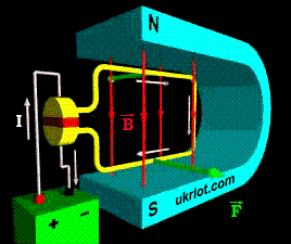 При взаимодействии кругового поля проводника и однородного поля магнита, между полюсами магнитное поле с одной стороны ослабевает, а с другой усиливается. То есть среда становится упругой и результирующая сила выталкивает провод из поля магнита под углом 90 градусов в направлении, определяемом по правилу левой руки (правило правой руки используется для генераторов, а правило левой руки подходит только для двигателей). Эта сила называется «амперовой» и её величина определяется по закону Ампера F=BхIхL, где В – значение магнитной индукции поля; I – ток, циркулирующий в проводнике; L – длина провода.