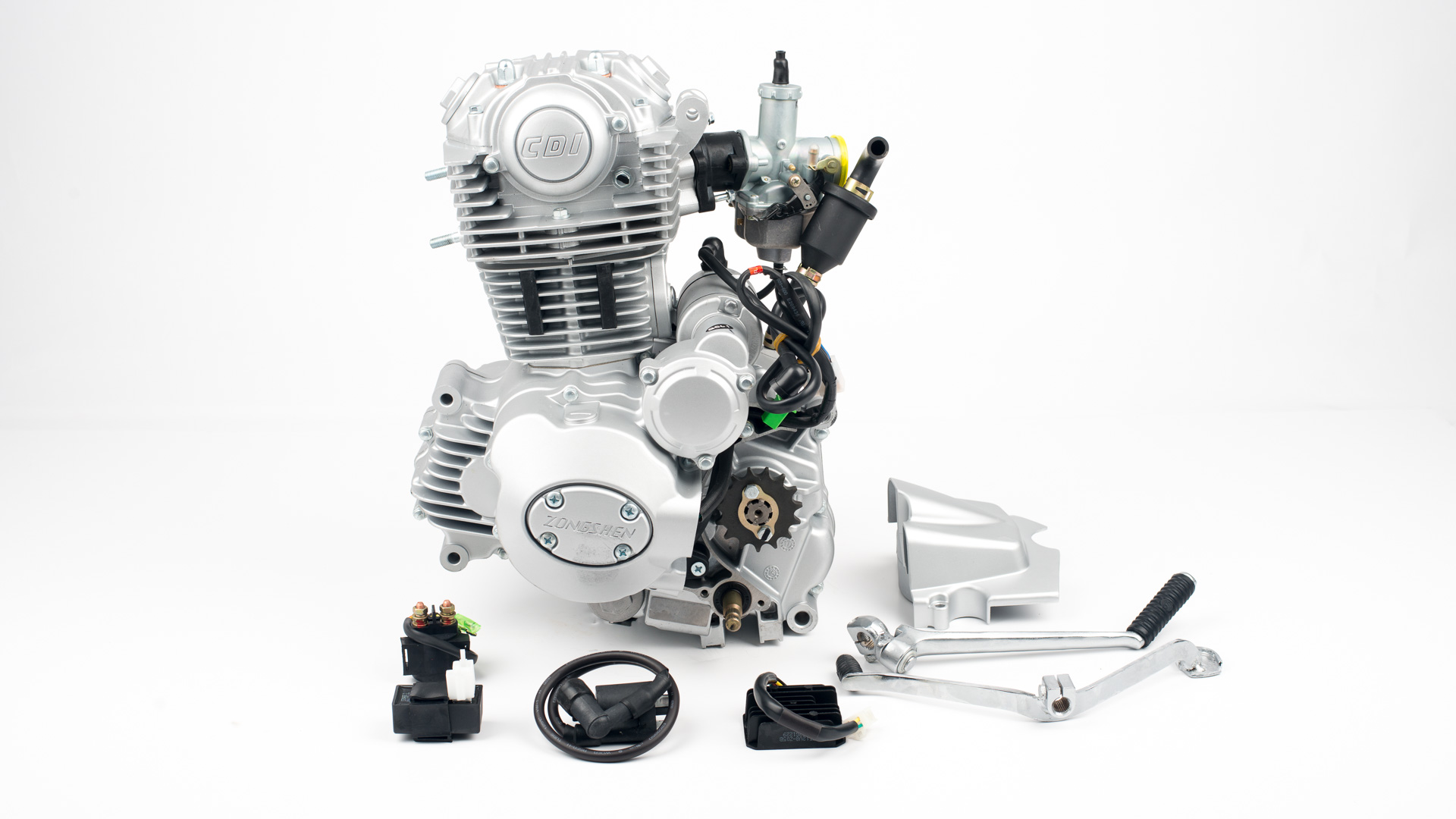 Новейший двигатель с увеличенным до 250куб.см, подходит практически на любую раму автомобилей на карбюраторах с двигателями 125-250куб.см! Идеальный предмет, благодаря которому вы сможете значительно увеличить мощность своего мотоцикла! Двигатель имеет ножной запуск, а также электрический запуск CDI. На заводе залито масло 10W40. Мощность, которую развивает этот двигатель, составляет 20 км при 9000 об/мин. 5-ступенчатая механическая коробка передач.