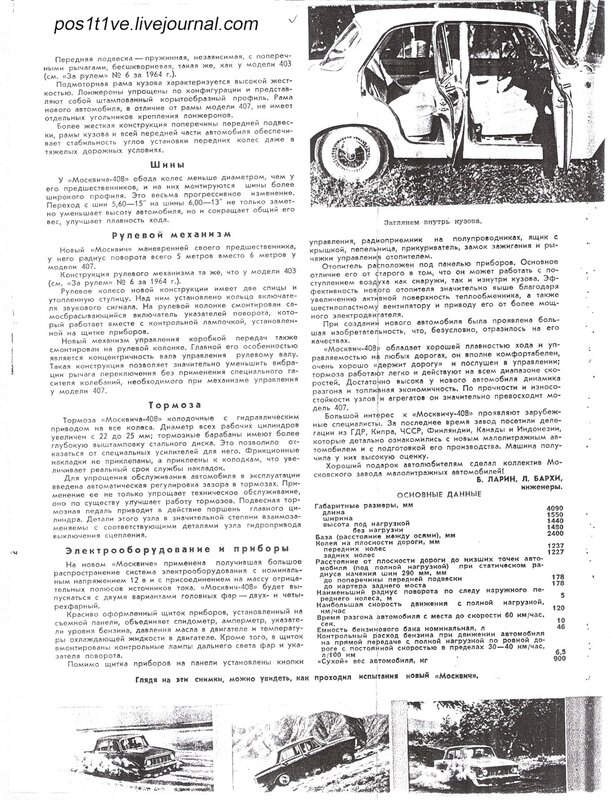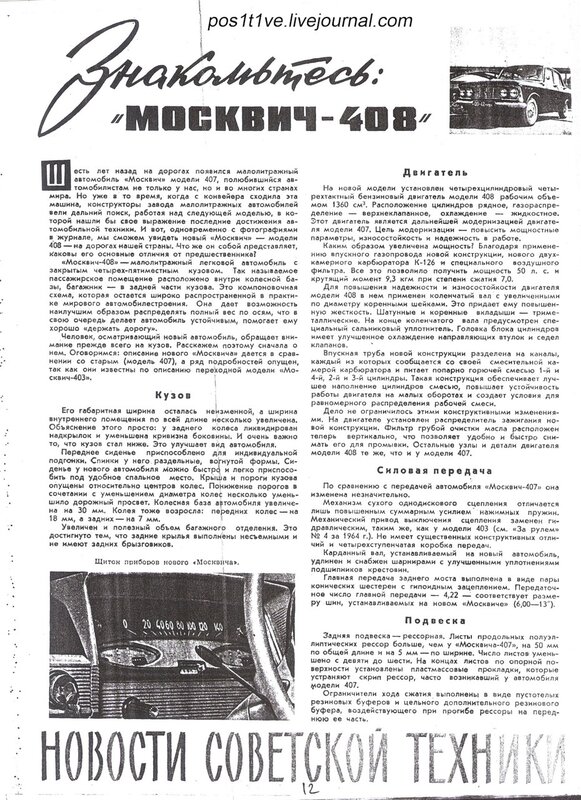 "...«Москвич-408» - малолитражный легковой автомобиль с закрытым четырех-пятиместным кузовом. Так называемое пассажирское помещение расположено внутри колесной базы, багажник – в задней части кузова. Эта компоновочная схема, которая остается широко распространенной в практике мирового автомобилестроения. Она дает возможность наилучшим образом распределить полный вес по осям, что в свою очередь делает автомобиль устойчивым, помогает ему хорошо «держать дорогу»Красиво оформленный щиток приборов, установленный на съемной панели, объединяет спидометр, амперметр, указатели уровня бензина, давления масла в двигателе и температуры охлаждающей жидкости в двигателе. Кроме того, в щиток вмонтированы контрольные лампы дальнего света фар и указатели повтора.Помимо щитка приборов на панели установлены кнопки управления, радиоприемник на полупроводниках, ящик с крышкой, пепельница, прикуриватель, замок зажигания рычажки управления отопителем.»......«При создании нового автомобиля была проявлена большая изобретательность, что, безусловно, отразилось на его качествах. «Москвич-408» обладает хорошей плавностью хода и управляемостью на любых дорогах, он вполне комфортабелен, очень хорошо «держит дорогу» и послушен в управлении, тормоза работают легко и действуют на всем диапазоне скоростей. Достаточно высока у нового автомобиля динамика разгона и топливная экономичность. По прочности и износостойкости узлов и агрегатов он значительно превосходит модель 407.Большой интерес к «Москвичу-408» проявляют зарубежные специалисты. За последнее время завод посетили Делегации из ГДР, Кипра, ЧССР, Финляндии, Канады и Индонезии, которые детально ознакомились с новым малолитражным автомобилем и с подготовкой его производства. Машина получила у них высокую оценку. Хороший подарок автолюбителям страны сделал коллектив Московского завода малолитражных автомобилей!"...