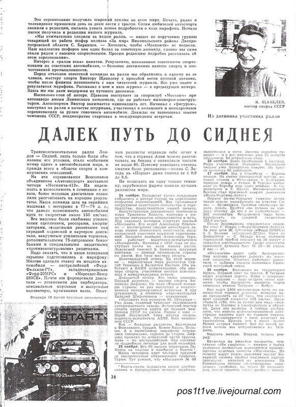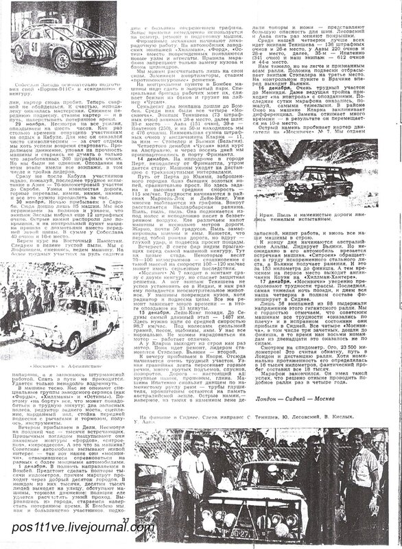 ка и что-то вроде кальсон вместо брюк. Но... в руках у него был автомат, который он держал так, будтоидет в атаку на сильно укрепленную позицию противника..." (из книги Юрия Клеманова "Москвичи на Москвичах")Все тот же журнал "За Рулем" в 1969 году описывал ралли Лондон - Сидней 1968 года ( 16.000 км, 11 стран)