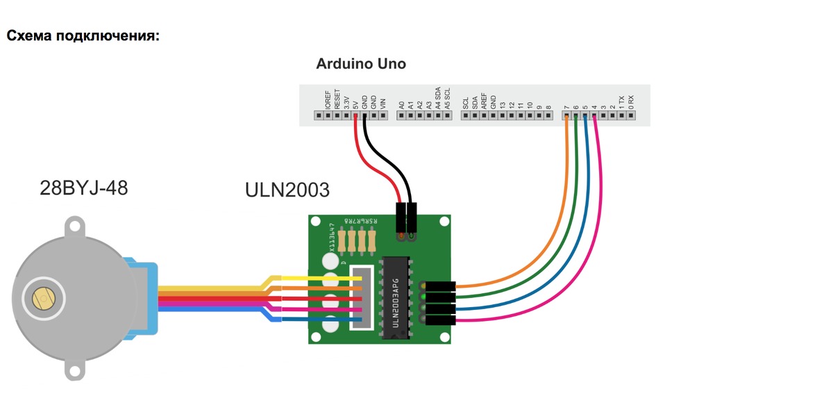 Схема подключения шагового двигателя 28BYJ-48 к Arduino Uno через драйвер ULN2003 изображена на рисунке ниже. Основные характеристики мотора 28BYJ-48: питание от 5 или 12 Вольт, 4-х фазный двигатель, угол шага 5,625°. Порты драйвера IN1 — IN4 подключаются к любым цифровым выводам платы Arduino Mega или Nano. Светодиоды на модуле служат для индикации включения катушек двигателя.