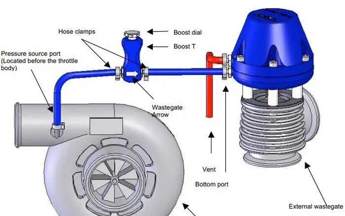Когда турбинное колесо турбонагнетателя с приводом от выхлопа вращается достаточно быстро, чтобы создать желаемый уровень наддува, обычно используется вестгейт, позволяющий избыточному давлению выхлопных газов отводиться вокруг турбинного колеса. При открытии вестгейта (обычно это относится к давлению наддува) давление выхлопных газов обходит турбинное колесо турбокомпрессора, чтобы предотвратить достижение турбонаддувом небезопасной скорости. Вы найдете внешние вестгейты на выхлопной (горячей) стороне трубопровода турбокомпрессора между турбинным колесом турбонагнетателя и выпускным коллектором, а иногда и в самом выпускном коллекторе, где он может направлять выхлопные газы перед турбонагнетателем и направлять их обратно в выхлоп.