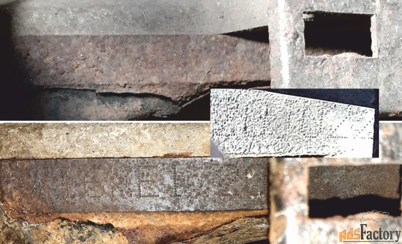 Для очистки подойдет WD-40, масло (можно использовать отработку), средство “Силит Налет и ржавчина”, и ветошь. И ещё нужно запастись терпением, которое скорее всего, будет вознаграждено. Улучшить чёткость едва наметившихся контуров можно при помощи мела. Им нужно натереть гравировку, а потом пройтись тряпкой. Мел останется в крошечных углублениях, и повысит контраст.