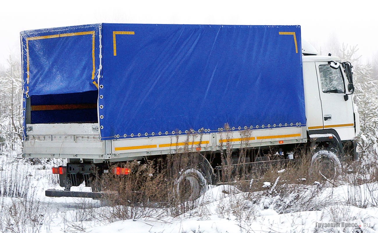 Да и кузов не впечатлил, на тестовом МАЗ 4372W2 стояла стандартная тентованная бортовая европлатформа, без каких-либо изысков. Справедливости ради отмечу, что для полноприводника, используемого по своему прямому назначению – движению по бездорожью, такой вариант исполнения совершенно не подходит. Надстройка на ухабах чувствует себя чересчур свободно, постоянно норовит высвободить запоры и распахнуть задний борт. Спасение от такого своеволия – полностью зачехлять тент или хотя бы контрить борт шнурком от этого самого тента. Впрочем, варианты исполнения полностью зависят от требования заказчика, так что, возможно, в серии мы таких простых машин и не увидим.