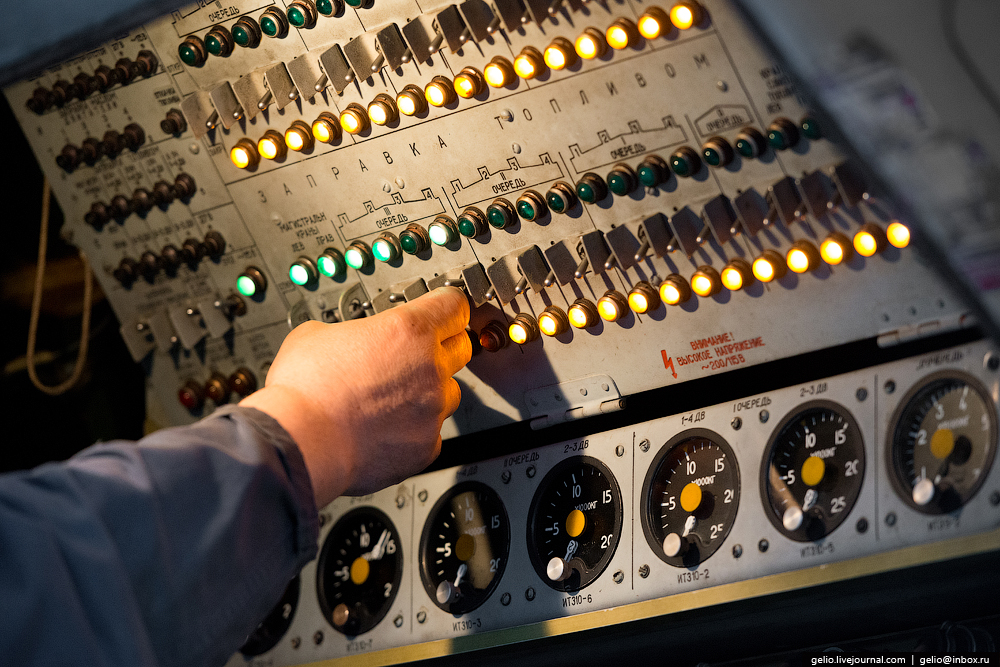 Во время заправки техник следит за равномерностью распределения топлива по бакам самолёта. На фото происходит открытие (закрытие) кранов соответствующих баков. Внизу указатели количества топлива.