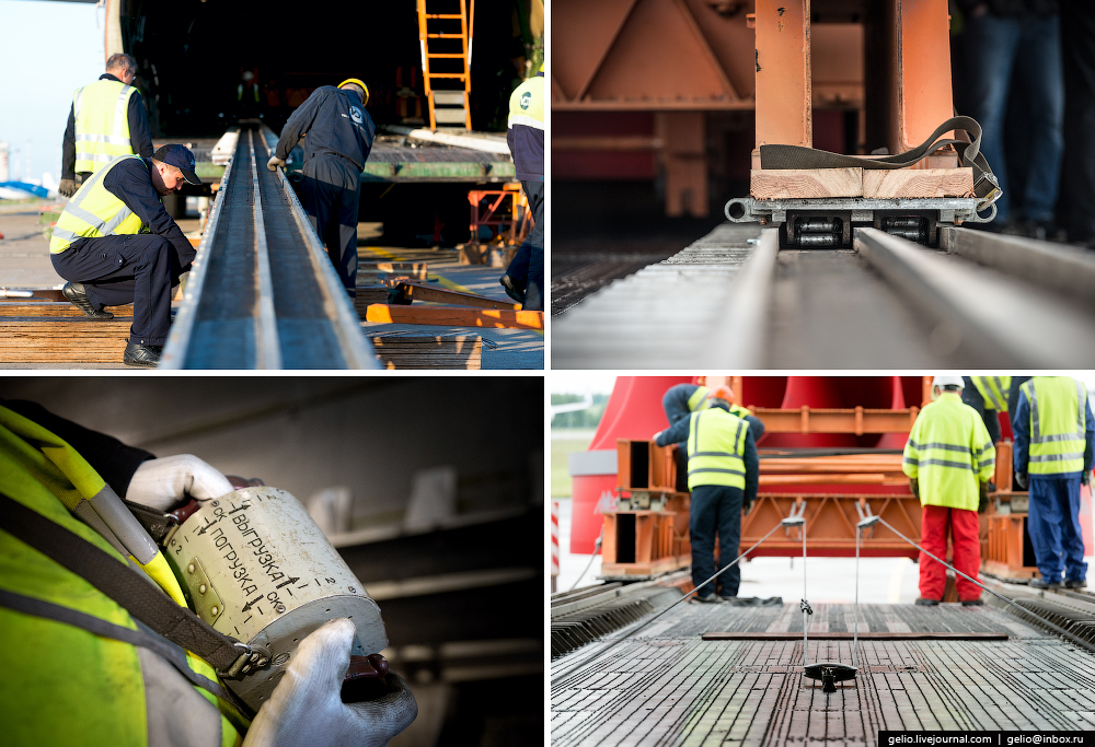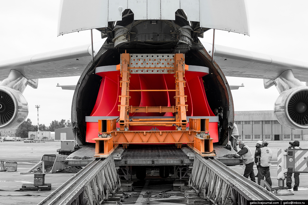 14. Для транспортировки колеса гидротурбины использовалось оборудование, распределяющее вес груза по полу грузовой кабины. Это как для передвижения по снегу нужны снегоступы. Также важно закрепить груз в грузовой кабине (зашвартовать). Неправильное решение этих задач чревато повреждением конструкции ВС и даже авиакатастрофой.