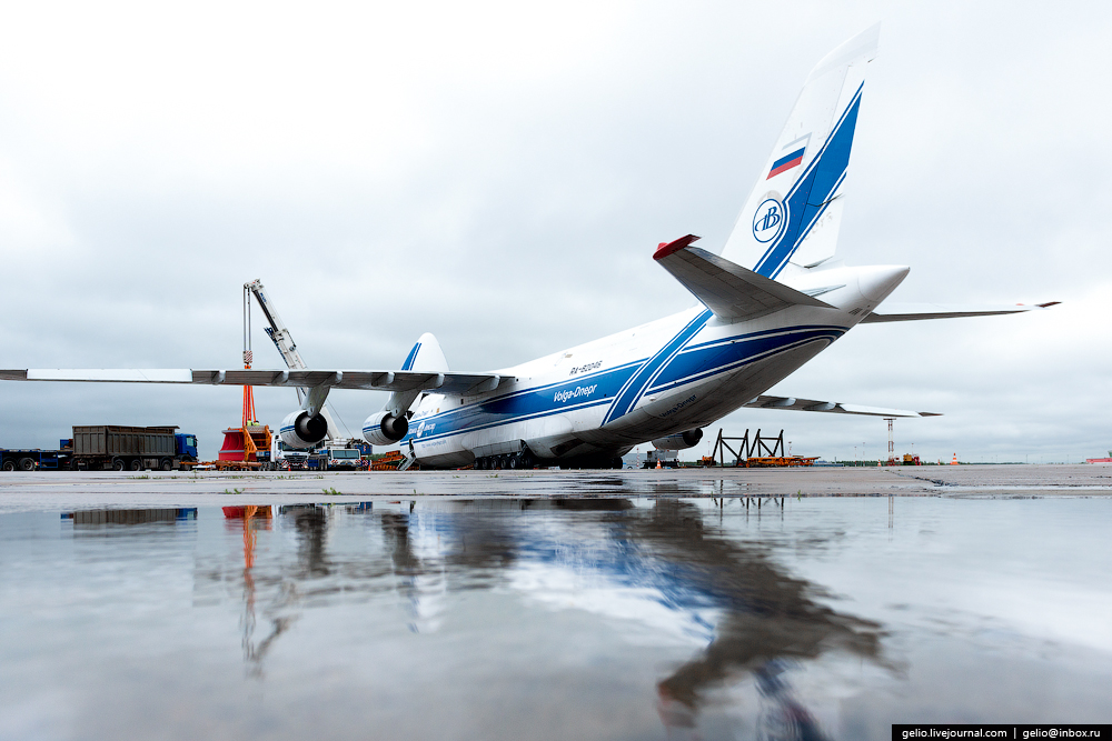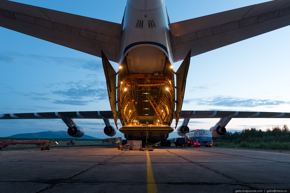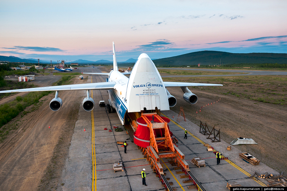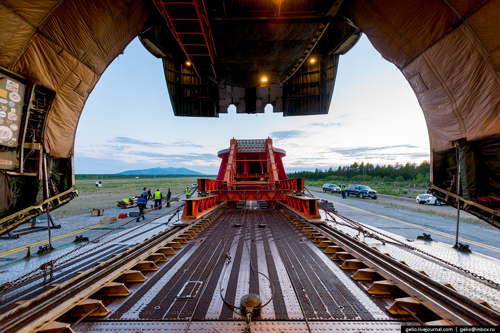 В июне этого года мне удалось присутствовать на уникальной транспортировке. 100-тонное колесо гидротурбины для Усть-Среднеканской ГЭС было доставлено «Русланом» из Питера в Магадан.