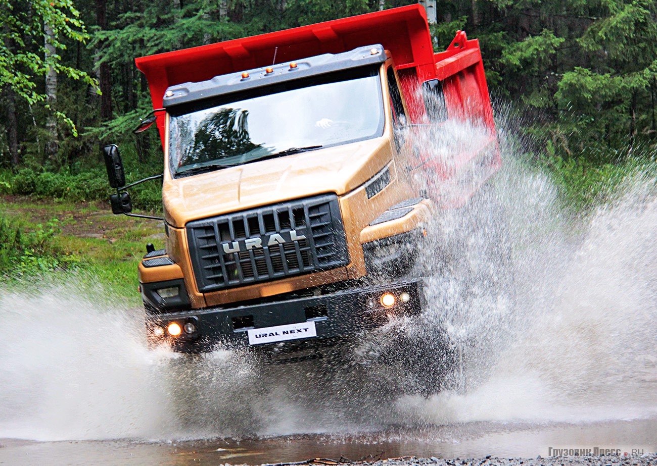 Привыкнув к работе КП, начинаю играть с бездорожьем. Четвёртая передача, разгон, пятая, прыжок, если бы сиденье водителя не было подрессорено, я в это мгновение сам бы себе не позавидовал! Кусочек неба впереди сменяется перспективой глубокой колеи, прыжок. Волна накрывает ветровое стекло и плавно стекает, напрочь лишив изображения в зеркалах заднего вида. Автомобиль, невозмутимо тарахтя довольно тихим дизелем, продолжает движение. Это был давно разрушенный деревянный мосток через водную преграду, глубиной с пол-метра, взятый штурмом на скорости под 70 км / ч. И это далеко не всё, на что способен «Урал-NEXT»!
