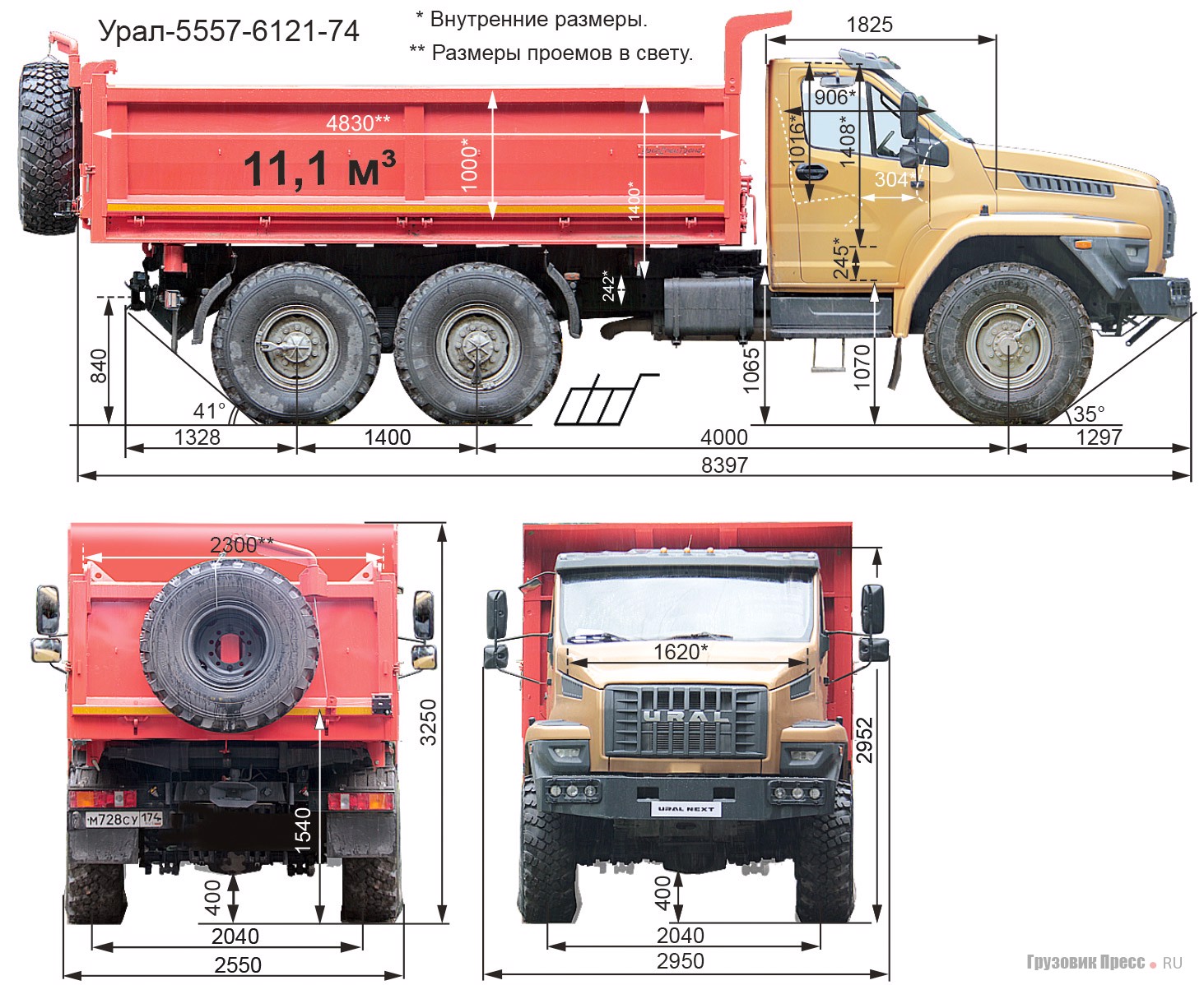 В длину «вахтовка» насчитывает 8985 до 10430 мм, ее высота достигает 3400 мм, а ширина укладывается в 2500 мм (с учетом внешних зеркал – 2950 мм). У двухосной модели расстояние между колесными парами простирается на 4605 мм, у трехосной же версии дела обстоят иначе: между передним и средним мостами здесь размещается 4755- миллиметровый промежуток, а еще 1400 мм приходится на базу задней тележки.