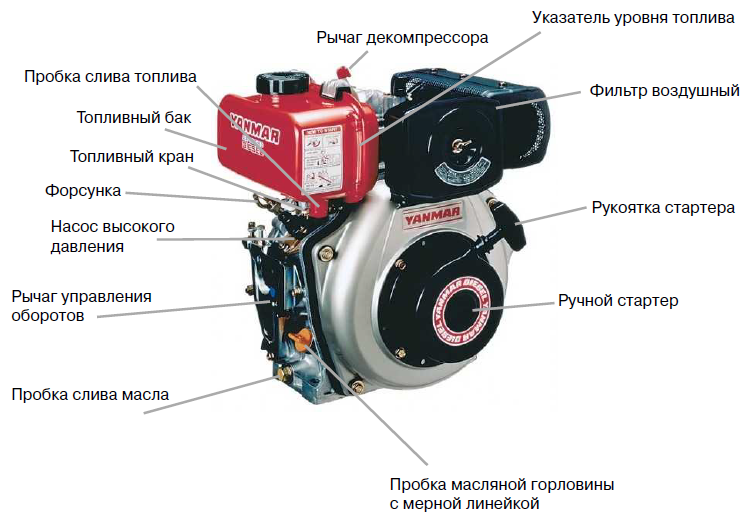 Дизельный двигатель L100V Yanmar - одноцилиндровый 4-х тактный дизельный двигатель с воздушным охлаждением и горизонтальным валом отбора мощности. Моторы Yanmar L100V оснащены регуляторами сбалансированного управления скоростью и системой декомпрессии Manual Type with Auto-return Lever.