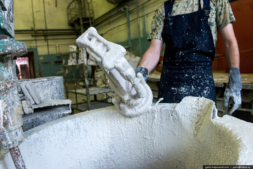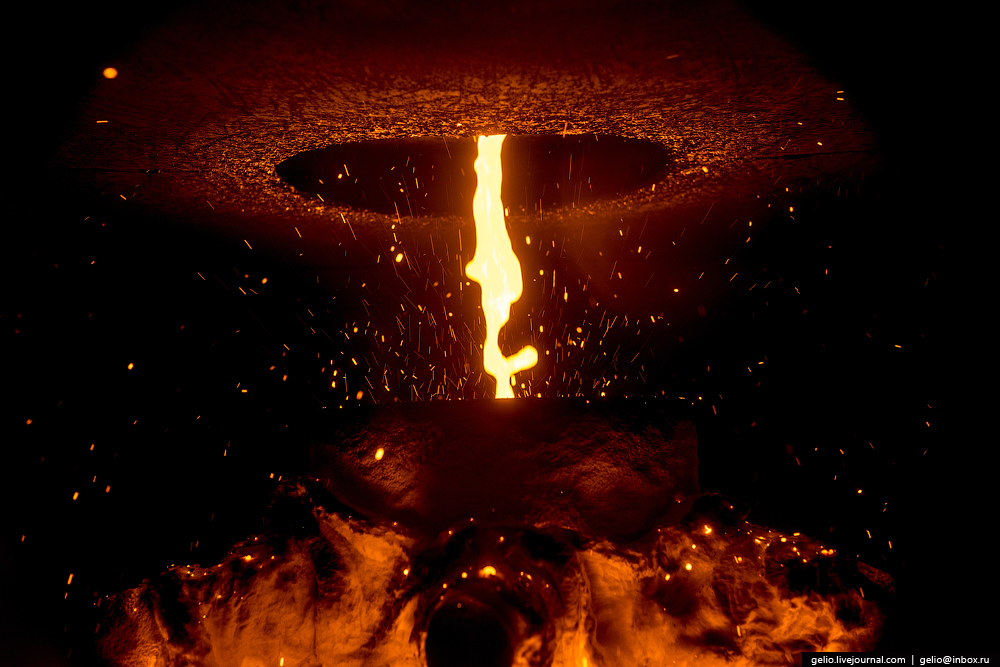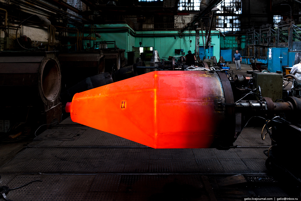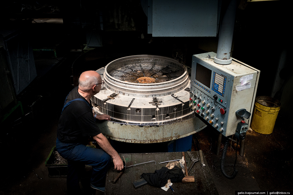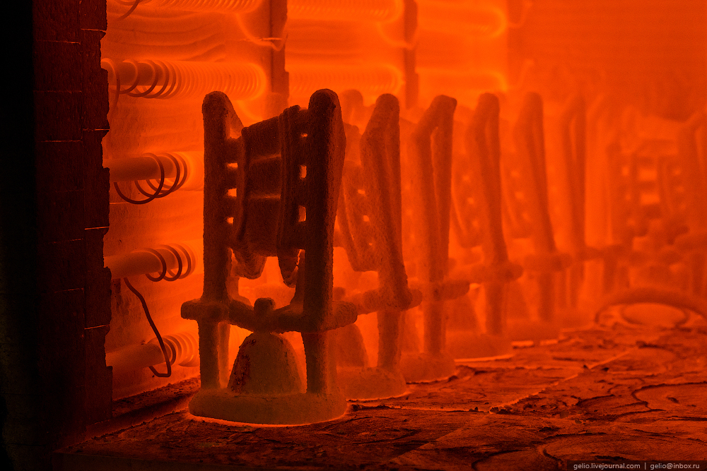 Этот участок способен отливать заготовки диаметром до 1600 мм и весом до 1500 кг, необходимые для корпусных деталей газотурбинных двигателей индустриального и авиационного применения. На фото показан процесс заливки детали в вакуумно-плавильной печи.