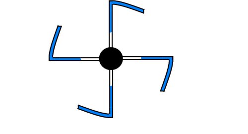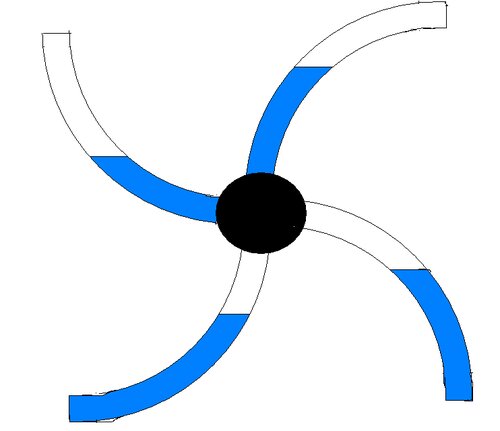 Я немного криво нарисовал, но учтите, что каждая лопасть - это четверть круга если камер 4 или соответственно пятая часть если камер 5 и т.д... Геометрия изгиба и наполнение - очень важны. Именно они создают разбаланс и смещение центра тяжести - а значит и совершается работа за счёт гравитационных сил.