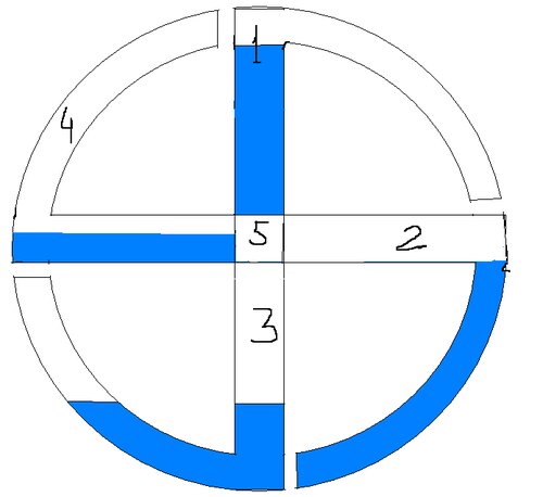 А теперь такой вариант.На рисунке неправильное расположение жидкости. Как будет правильно?Предположим варианты:1. Каждая из четырёх лопастей НЕ соединена с другими.2. Каждая соединена со всеми3. Соединена только с противоположной4. Соединена только с соседской5. Соединена со всеми, но через механизм запирания, дозирующий перетекающее.Опишите процесс, если раскрутить по часовой стрелке.