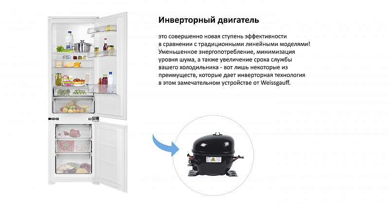 Кроме того, новый тип двигателя обеспечивает стабильное поддержание температуры на одном уровне. Инверторным холодильникам не свойственны периодические перепады в несколько градусов, благодаря чему продукты в холодильной и морозильной камерах дольше сохраняют свои внешние качества и изначальный витаминный состав.