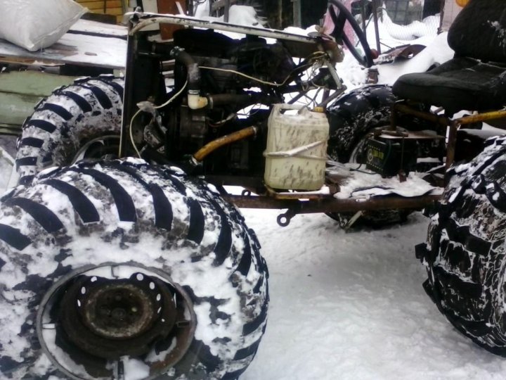 Рама вместе с мостами от УАЗика, раздаточная коробка от Нивы. Колеса ободранные от ГАЗ-66, колесные диски сделаны из дисков от Волги. Простая конструкция полноприводного вездехода
