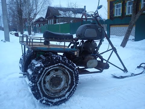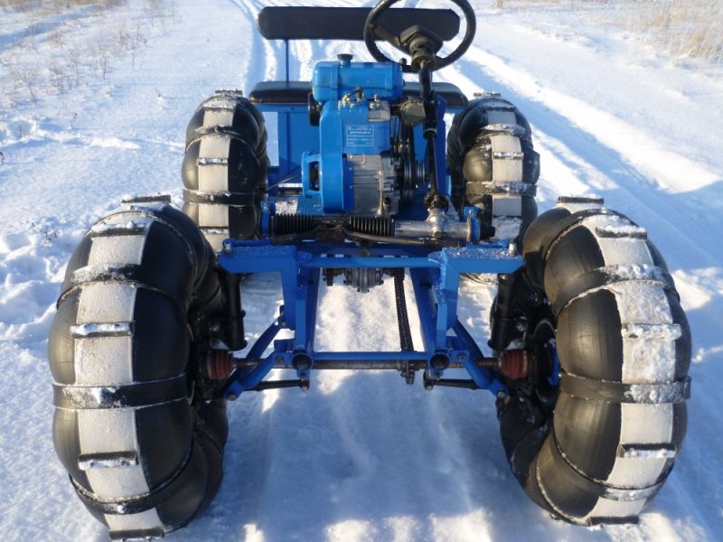 Не стандартный по конструктивному решению полноприводный каракат «переломка» с двумя двигателями от ИЖ планеты. По сути два отдельных одинаковых привода оледененных ломающимся узлом. Двигатели переделаны на жидкостное охлаждение заменой цилиндров от пускача. Систему прокачивает Газелевская помпа, вентилятор и радиатор от ВАЗ2106.