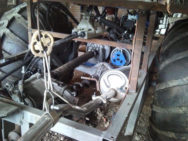 Кузов и ходовая Запорожца оставалась без изменений, просто была сварена отдельная рама, на которую ставится кузов и привод с заднего моста, прямо со ступиц с помощью цепей идет на большие колеса…