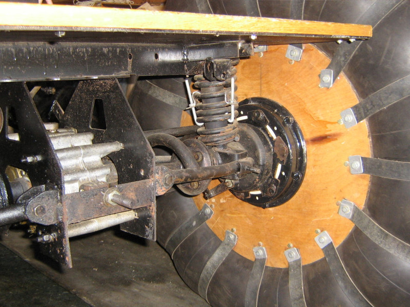 Колесные диски полностью самодельные, камеры от К-700, на них надеты ещё по одной камере и транспортёрная лента. Ремни клиновые, профиль Д. На концах крючки из катанки 6мм, на которые цепляются цепи. Клиренс – 50 см. Рулевое управление сделано из шестирни от стартёра КрАЗа и самодельная изогнутая зубчатая рейка, шарнир от кардана КрАЗа, к нему приварен болт М50, на котором накручена гайка. К этой гайке приварены уголки задней тележки, ограничителей вращения нет, тележка может вращаться на 360 градусов.