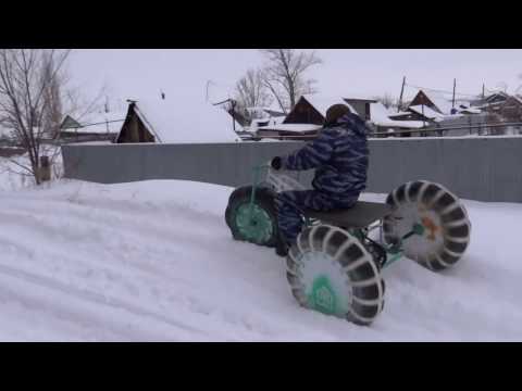 Интересный вариант бюджетного простого вездехода снегохода. Подвески без амортизаторов, но сделаны по принципу коромысла, задние двигаются вдоль кузова, а передние колеса поперек, привод задних колес цепной