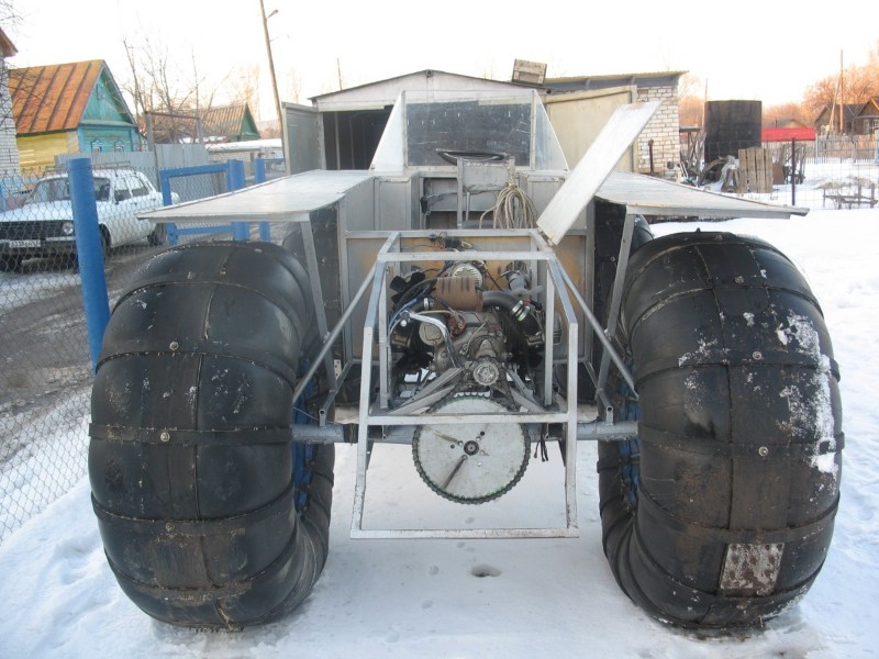 Как круги на воде, расходились во все стороны слухи о чудо-аппарате. Идею народного «проходимца» подхватили и начали «раскручивать» журнал «Моделист-конструктор». Всесоюзное общество изобретателей и рационализаторов, ДОСААФ. С 1984 по 1991 годы проводились всесоюзные конкурсы самодельных вездеходов на пневматиках. Любопытно, что на втором таком конкурсе, проходившем е Архангельске, собралось множество самоделыциков со своими аппаратами, изготовленными… из фанеры. С виду это были скорее лодки, чем наземные средства передвижения. Мотоциклетный мотор приводил две пары задних балансирно подвешенных камер-колес от «ГАЗ-53». Передние колеса подвешивались на поперечном балансире.