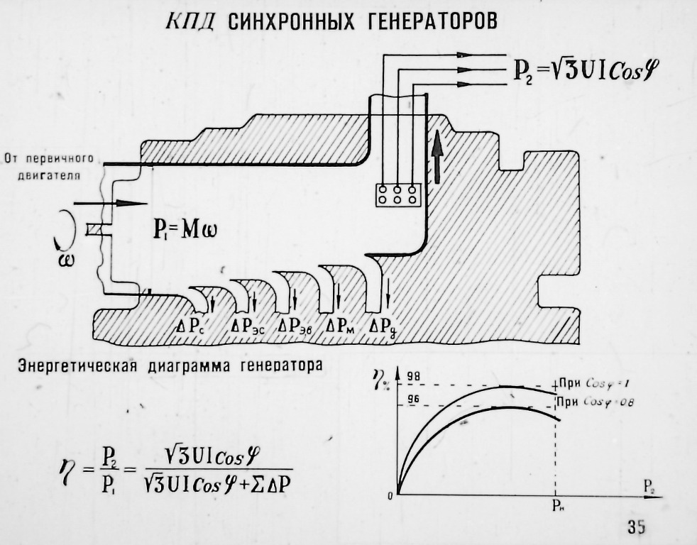 Другая часть этой мощности идет на покрытие магнитных потерь в сталь генератора. Оставшееся мощность — это электромагнитная мощность, которую можно определить через электрические величины генератора, либо с помощью энергетической диаграммы Рэм = Еа𝐼𝑎 = 𝑃1 − (𝑃мех +