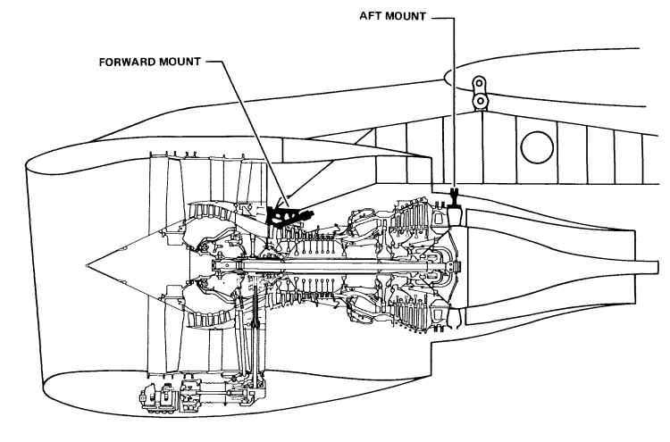 Двигательные крепления рассчитаны на нормальную работоспособность при разрушении одного из элементов крепления. То есть, для переднего узла подвески это означает потерю одного из болтов крепления к пилону.