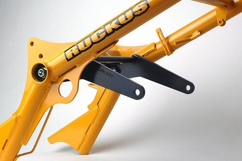 BUM продается на rucksters.com, здесь поперечина смещена в сторону петель двигателя. Если честно, опять сомневаюсь, что он подойдёт для GY6. На моторе расстояние между петлями крепления меньше, чем такое же на раме, а здесь на фото удлинители выглядят параллельными. Цена стартует от 320$ на rucksters.com