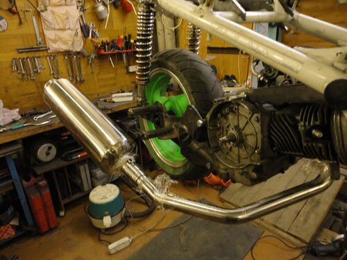 Поэтому глушитель ушел далеко в сторону от колеса: