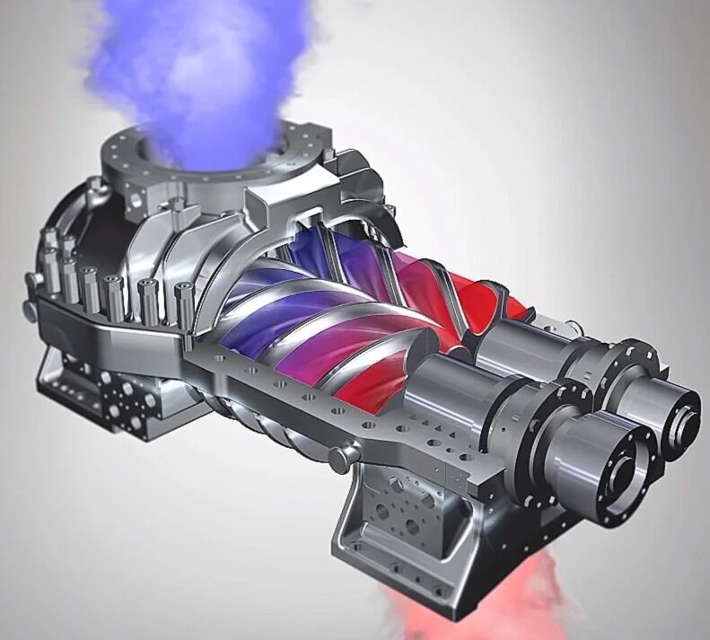 Винтовые воздушные компрессоры генерируют энергию за счет двух внутренних роторов, вращающихся в противоположных направлениях. Воздух попадает между двумя противоположными роторами и создает давление внутри корпуса.
