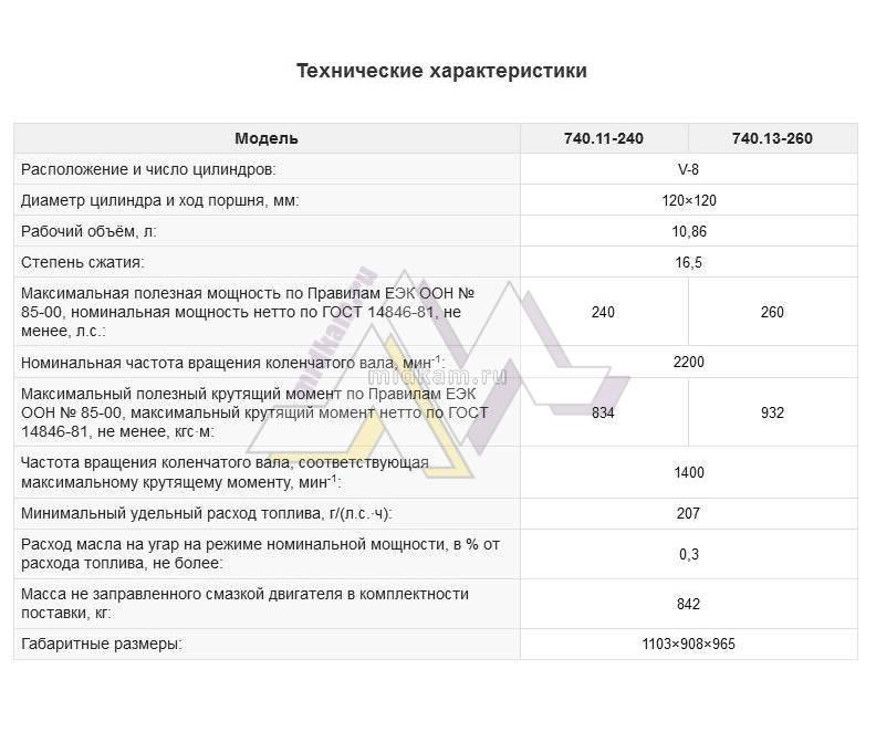 В зависимости от года выпуска и поколения двигатели КамАЗ-740 имеют разные экологические нормы: от Евро-0 до Евро-5. Итак, рассмотрим основные технические характеристики силового агрегата 740 и его модификаций.