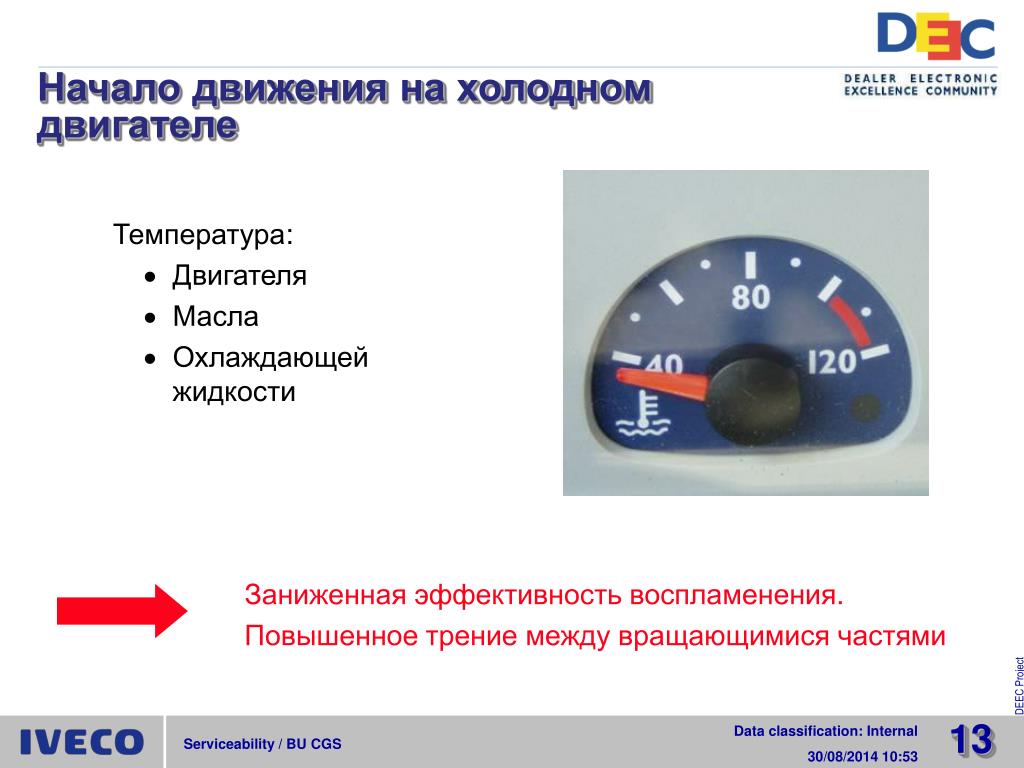 Достаточно прогретым агрегат можно считать в том случае, когда все узлы, механизмы и жидкости выйдут на рабочие температуры. Первой нагревается охлаждающая смесь. Это видно по стрелке. Она же нагревает поршне-цилиндровую группу. Масло нагревается значительно медленнее. Владельцы тех автомобилей, которые оснащены бортовыми компьютерами, могли заметить, что после выхода на рабочий температурный режим расход топлива, даже если это холостой ход двигателя, может уменьшаться.