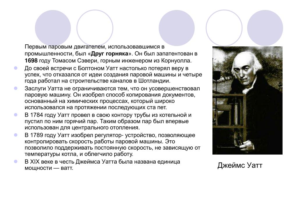| Николя-Жозеф Кюньо (1725-1804) | 1769 | STEAM / Построена первая самоходная дорожная машина (военный тягач) для французской армии: трехколесная, скорость 2,5 мили в час.![]() | Франция |