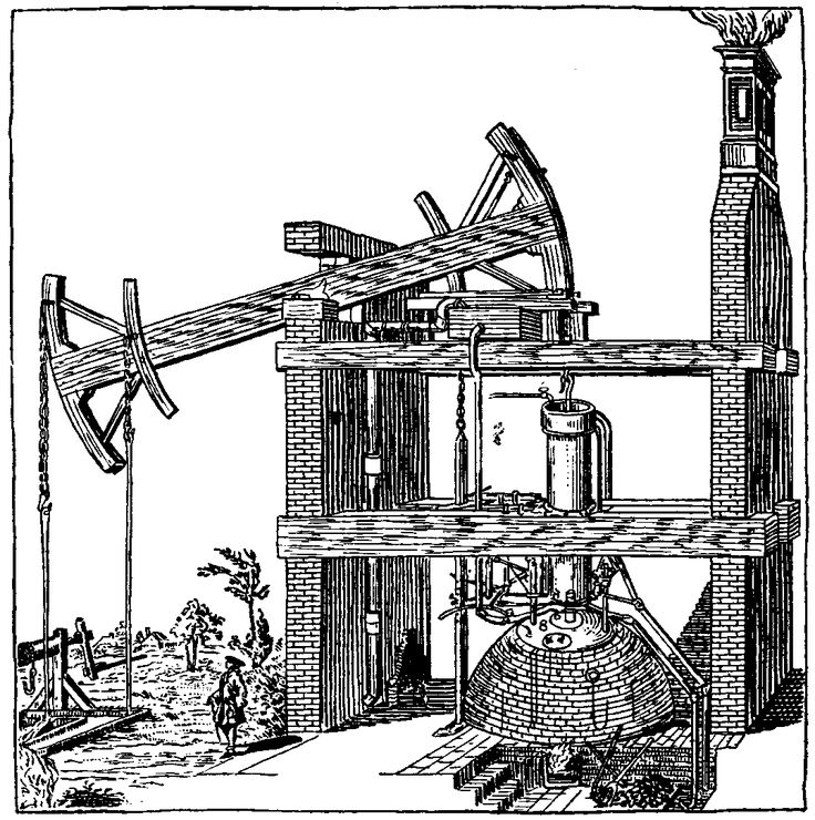 Двигатель Томаса Савери в 1690-х годах сначала всасывал воду вверх по трубе, и только затем нагревал ее, чтобы гнать дальше вверх. А двигатель Томаса Ньюкомена 1710-х годов — тот, который станет наиболее используемым и, следовательно, самым известным — вообще не использовал расширяющую силу пара. Пар вводился в цилиндр под поршнем, удерживаемым противовесом. Этого пара было тогда конденсируется струей холодной воды, образуя частичный вакуум под поршнем. Всю работу сделал внезапный огромный относительный вес атмосферы над этим частичным вакуумом. Вот почему двигатель Ньюкомена также называют атмосферным двигателем.