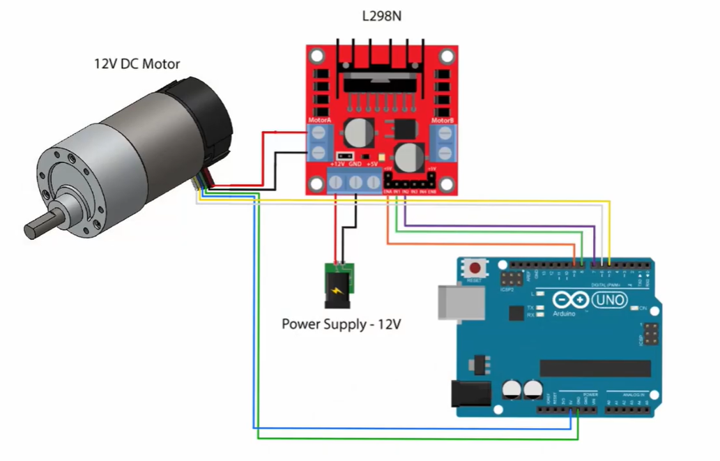 L298N — довольно распространенный контроллер, используемый с Arduino Uno. Подключите сигнальные контакты следующим образом: