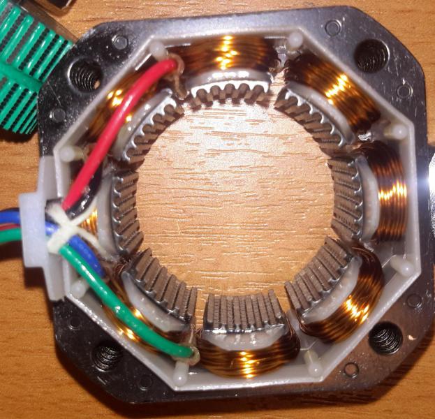 Ротор представляет собой постоянный магнит, и поэтому, когда на пару полюсов статора подается ток, ротор будет двигаться, чтобы выровняться с ним. Шаги угла этого двигателя 1,8, 7,5,15,30,34 и 90 градусов.