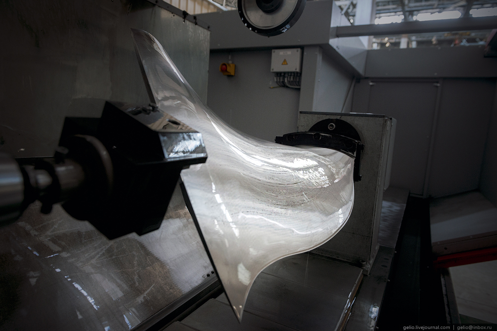 26. Участок обработки полой широкохордной вентиляторной лопаткиДля производства полых широкохордных вентиляторных лопаток двигателяПД-14 — движущей установки перспективного гражданского самолёта МС-21 —создан специальный участок, где осуществляется вырезка и механическая обработка заготовок из титановых плит, окончательная механическая обработка замка и профиля пера лопатки, включая его механическую шлифовку и полировку.