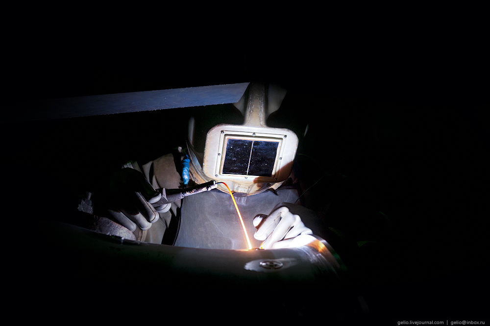 5. В полном облачении сварщик, действительно, похож на космонавта. Чтобы получить допуск к работе в обитаемой камере, рабочие проходят курс обучения, вначале они в полной экипировке тренируются на воздухе. Обычно двух недель достаточно, чтобы понять, годится человек для такой работы или нет — нагрузки выдерживает далеко не каждый.