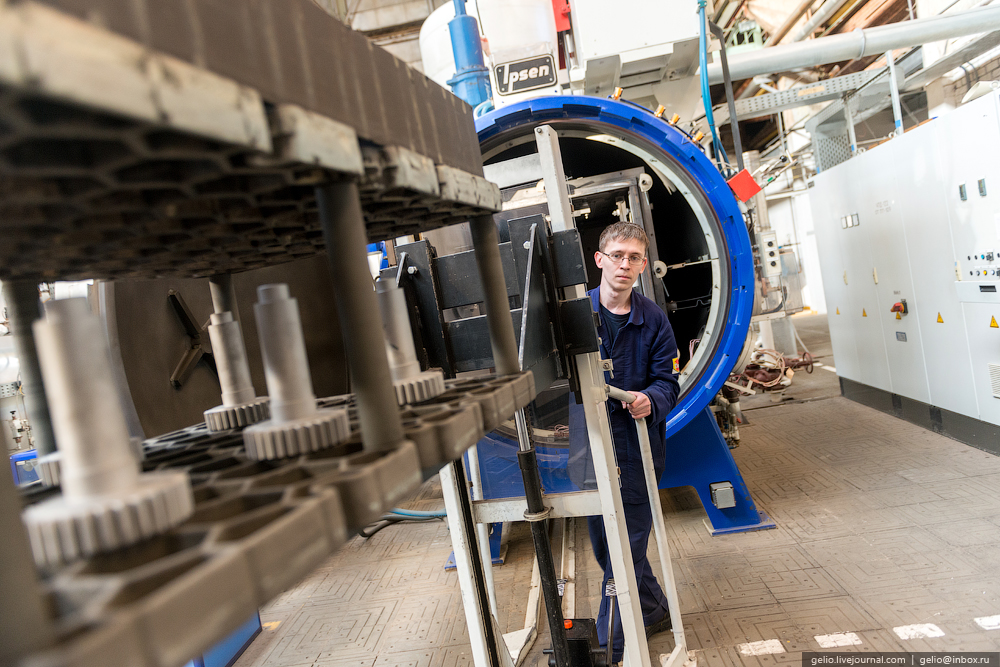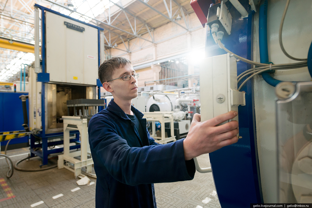 18. Для обслуживания печи достаточно одного работника. Детали проходят химико-термическую обработку в течение нескольких часов, после чего становятся идеально прочными. Специалисты УМПО создали собственную программу, которая позволяет осуществлять цементирование с повышенной точностью.