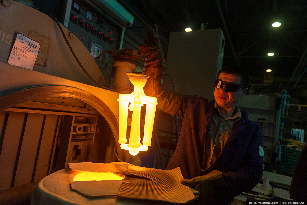 6. Металлургическое производство. Этот участок способен отливать заготовки диаметром до 1 600 мм и весом до 1 500 кг, необходимые для корпусных деталей газотурбинных двигателей индустриального и авиационного применения. На фото показан процесс заливки детали в вакуумно-плавильной печи.
