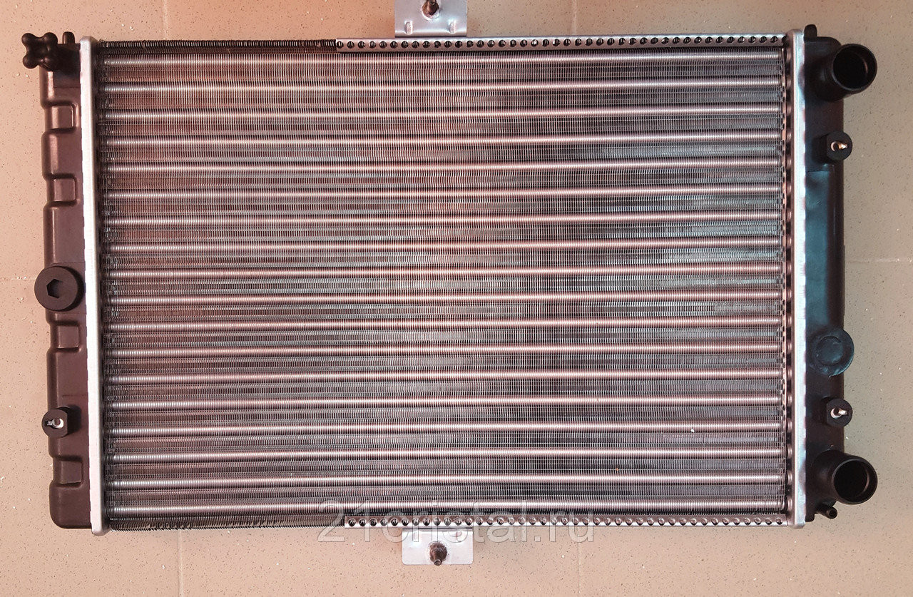 Стандартный радиатор системы охлаждения карбюраторного двигателя автомобилей ВАЗ 2108, 21081, 21083, 2109, 21091, 21093, 21099 трубчато-пластинчатый с пластмассовыми бачками. Средняя часть радиатора состоит из нескольких алюминиевых трубок, по которым циркулирует ОЖ, объединенных в каркас. По бокам каркаса из трубок на резиновых уплотнителях установлены пластмассовые бачки. Трубки защищены алюминиевыми пластинами.
