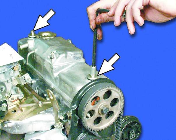 5. Снимите ремень привода распредвала, натяжной ролик и дистанционную шайбу, установленную под ним (см. «Замена на автомобилях ваз 2108, ваз 2109, ваз 21099 ремня привода распредвала и регулировка натяжения ремня»), (см. «Замена натяжного ролика»).