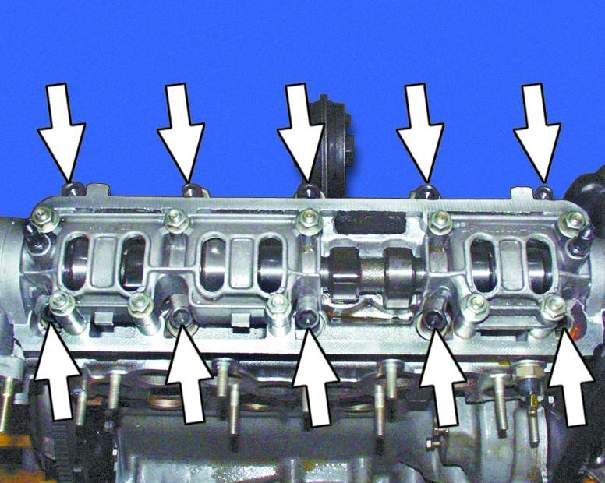 20. Отверните по два болта крепления пяти крышек коренных подшипников.