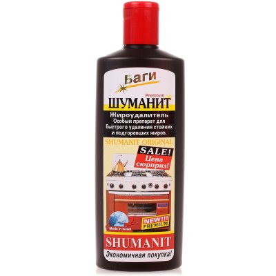 Протереть влажной тряпкой и смыть средство водой. При необходимости повторить обработку. Меры предосторожности: Рекомендуется использовать резиновые перчатки. Не использовать …*Шуманит жироудалитель. Средство для мгновенного удаления въевшихся, стойких и пригоревших жировых загрязнений с плит, духовых шкафов, вытяжек, пароуловителей, грилей, кастрюль, сковородок и других поверхностей. Способ применения: Равномерно распылить средство на загрязненную поверхность, оставить от 30 секунд до 1 минуты. Протереть влажной тряпкой и смыть средство водой. При необходимости повторить обработку. Меры предосторожности: Рекомендуется использовать резиновые перчатки. Не использовать для чистки изделий из алюминия, окрашенных поверхностей и тефлоновых покрытий. Хранить в недоступном для детей месте. Избегать попадания в глаза и на кожу. В случае попадания немедленно промыть большим количеством воды. При случайном проглатывании запить большим количеством воды и немедленно обратиться к врачу. Перед применением рекомендуется протестировать продукт на незаметном участке.