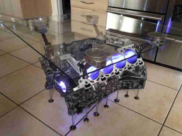 Перед вами стол, входящий, несомненно, в эту категорию мебели. И вряд ли стоит объяснять почему – блок двигателя, который выполняет функцию опоры стола, сам по себе очень красноречив. Поверх него располагается стеклянная поверхность, позволяющая использовать модель по назначению. Обратите внимание, что деталь, которая бы уместней смотрелась под капотом Bentley, располагается на колесиках. Они позволяют сравнительно легко передвигать громоздкую деталь интерьера.