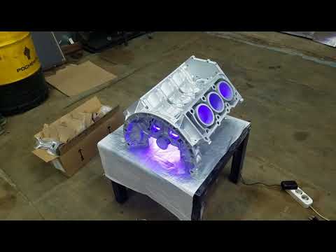 Блок был отмыт в кислоте , отпескаструен , отшлифован , полностью покрыт грунтам и окрашен в серебристый цвет .