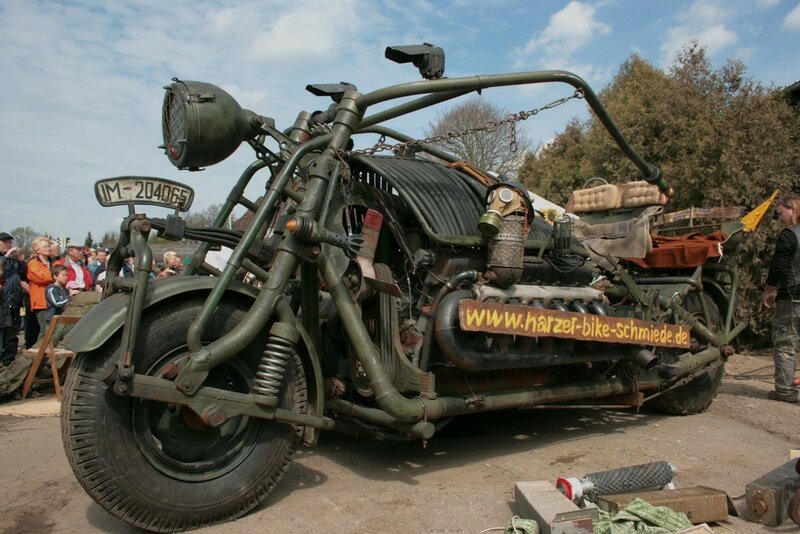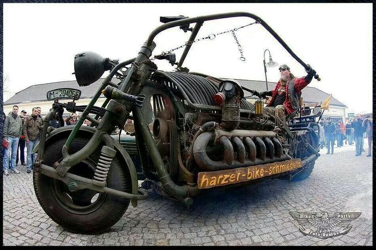Panzerbike. Но самым диковинным аппаратом с танковым двигателем был вовсе не автомобиль, а… мотоцикл. Построили его в 2007-м немцы из клуба Harzer Bike Schmiede под руководством Тило Нибеля и теперь регулярно демонстрируют на различных европейских байк-шоу. Этого 5,5-метрового зверя приводит в движение советский танковый двигатель В-55, устанавливавшийся на танки Т-55 (причём довольно новый, 1986 года выпуска, если верить создателям мотоцикла). Весит мотоцикл 4740 кг – это мировой рекорд для мотоциклов, занесён в Книгу Рекордов Гиннесса. Все детали мотоцикла были добыты из металлолома – в основном это детали списанной военной техники. Сперва, кстати, байкеры хотели поставить на мотоцикл мотор от Т-34, но затем решили не мелочиться.