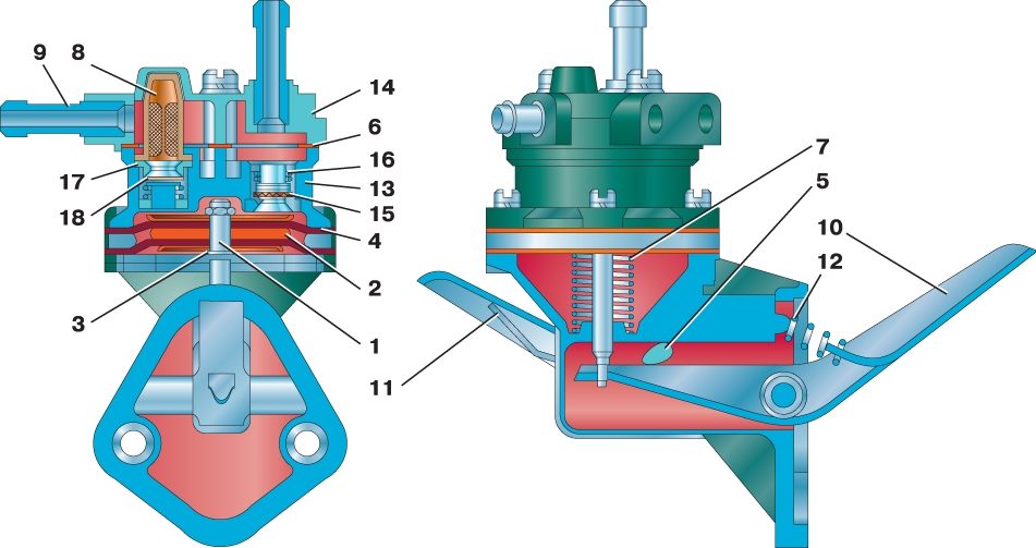 Топливный насос состоит из сборных корпусных узлов с диафрагмой 8 и приводным рычагом 9, головки с клапанами 4 и 7 и крышки. между корпусом и головкой насоса зажата диафрагма из четырех лепестков из лакоткани.