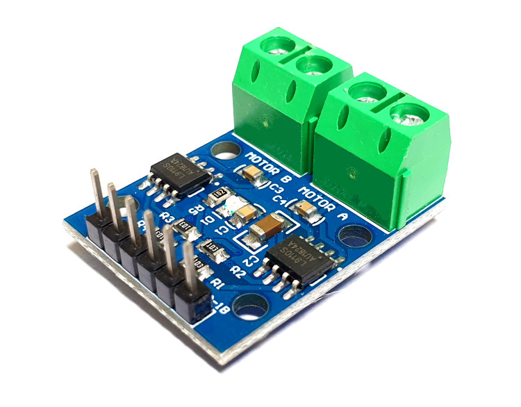 Этот мостовой драйвер управляет двигателем с током до 2 А и питанием до 46В. Модуль на основе драйвера L298N состоит из микросхемы L298N, системы охлаждения, клеммных колодок, разъемов для подключения сигналов, стабилизатора напряжения и защитных диодов.