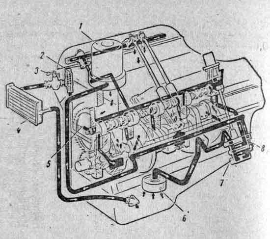 При такте впуска в цилиндре двигателя создается разряжение, передающееся в карбюратор и в установленный на нем воздушный фильтр. Очищенный воздух проходит в смесительную камеру, где из жиклеров подается топливо. Испаряющееся топливо перемешивается с воздухом, образуя горючую смесь. Из карбюратора по впускному трубопроводу горючая смесь поступает в цилиндры двигателя. Газы, образовавшиеся после быстрого сгорания рабочей смеси в цилиндре, расширяются, давят на поршень, и он опускается в низ, совершая рабочий ход. После рабочего хода отработавшие газы через открытый выпускной клапан вытесняются поршнем в выпускной трубопровод. Затем они поступают в приемные трубы глушителя, выпускную трубу и в атмосферу.