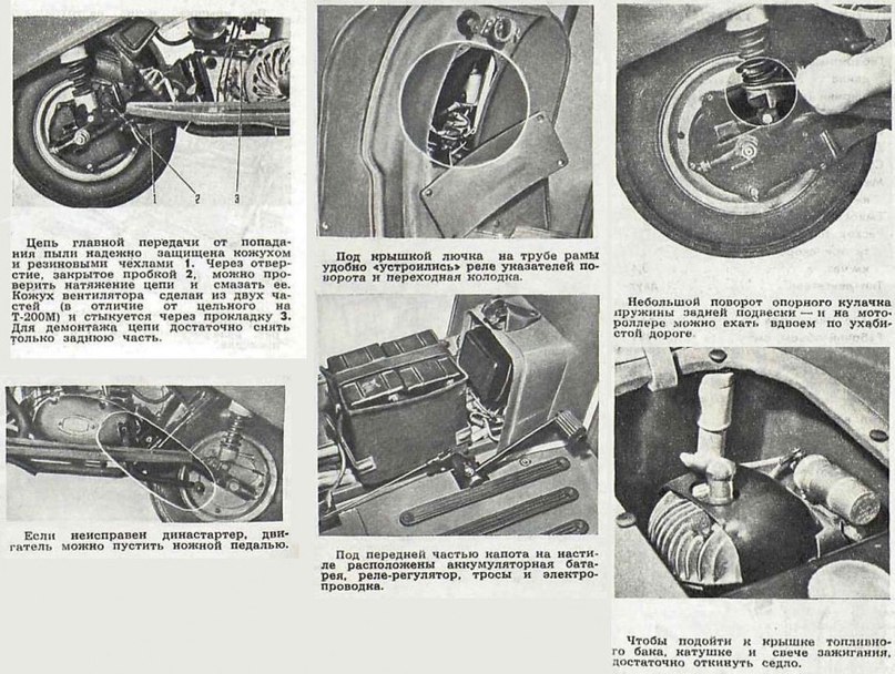 В заключение отметим, что правила эксплуатации и регулировки остальных узлов мотора Т—200A аналогичны рекомендуемым для «Туриста» и достаточно подробно изложены в инструкции по эксплуатации мотороллера.